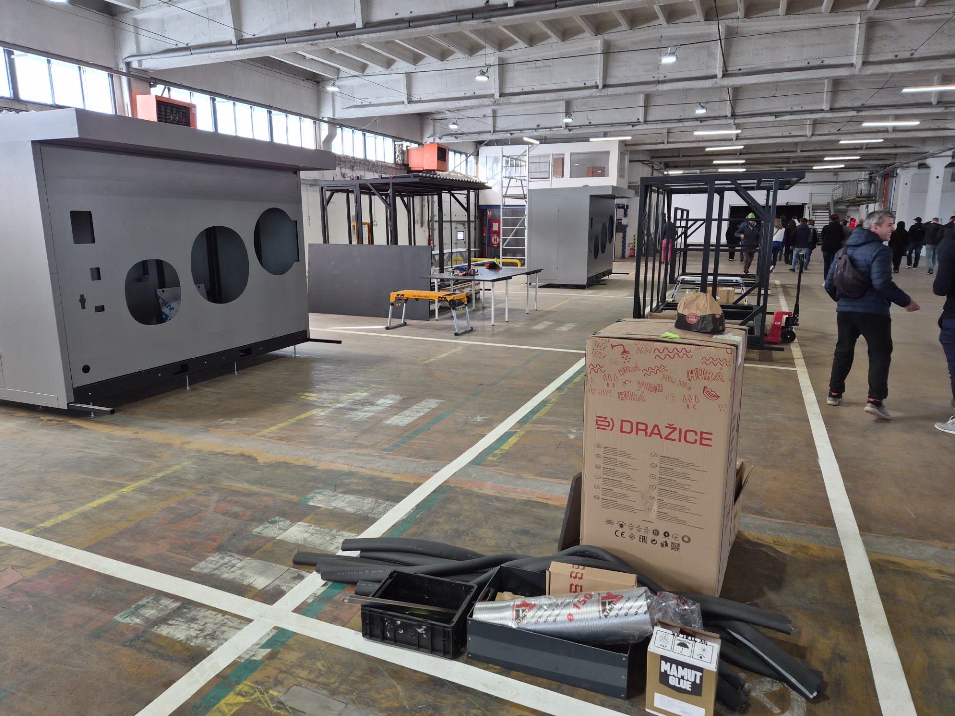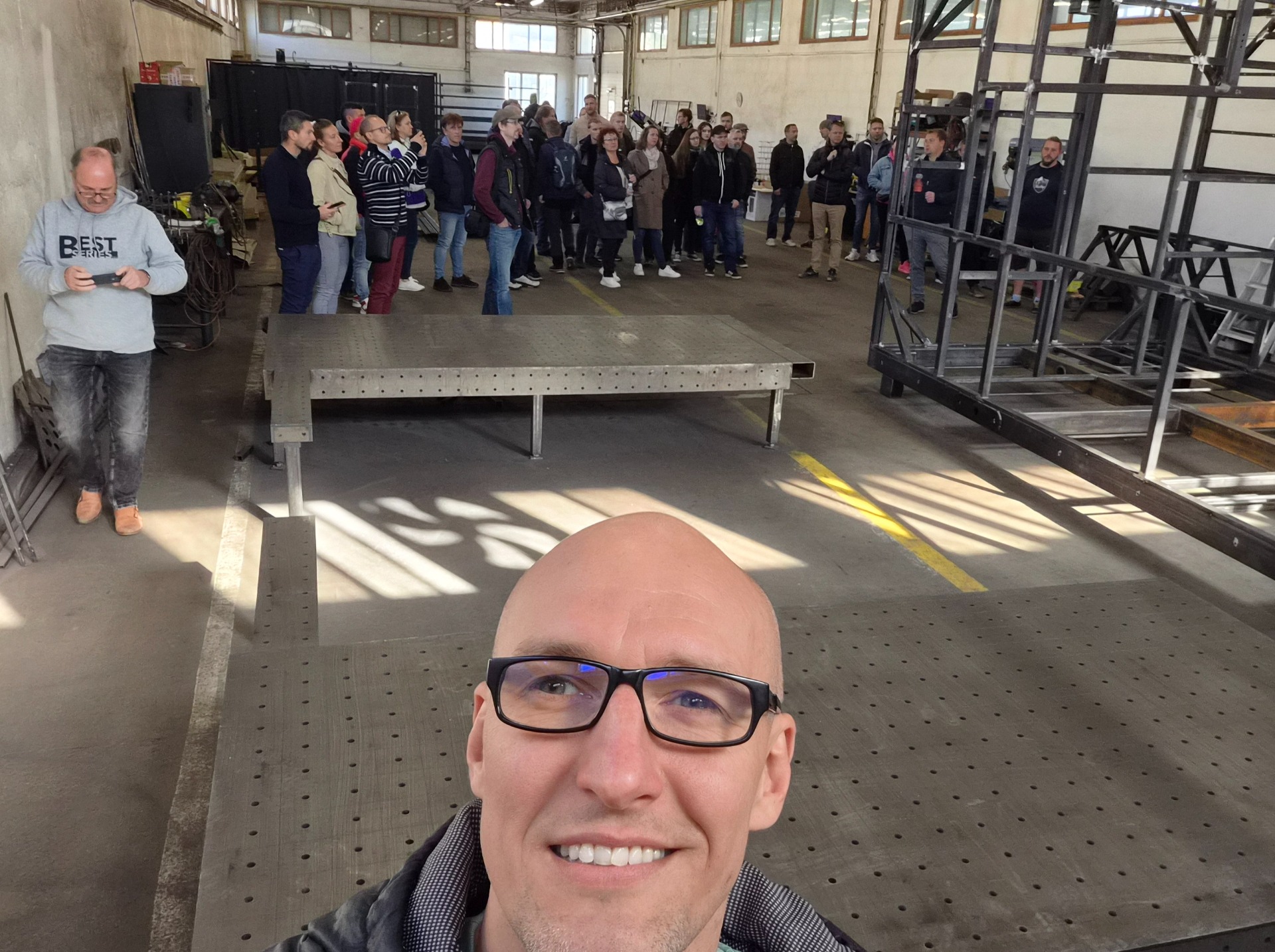 Následně jsme se přesunuli do jedné ze tří výrobních hal. V té první (500 m2) se skladuje surový materiál, který se připravuje na požadované rozměry, kosí se úhly, vrtají díry a vytváří hrubá konstrukce 🛠️