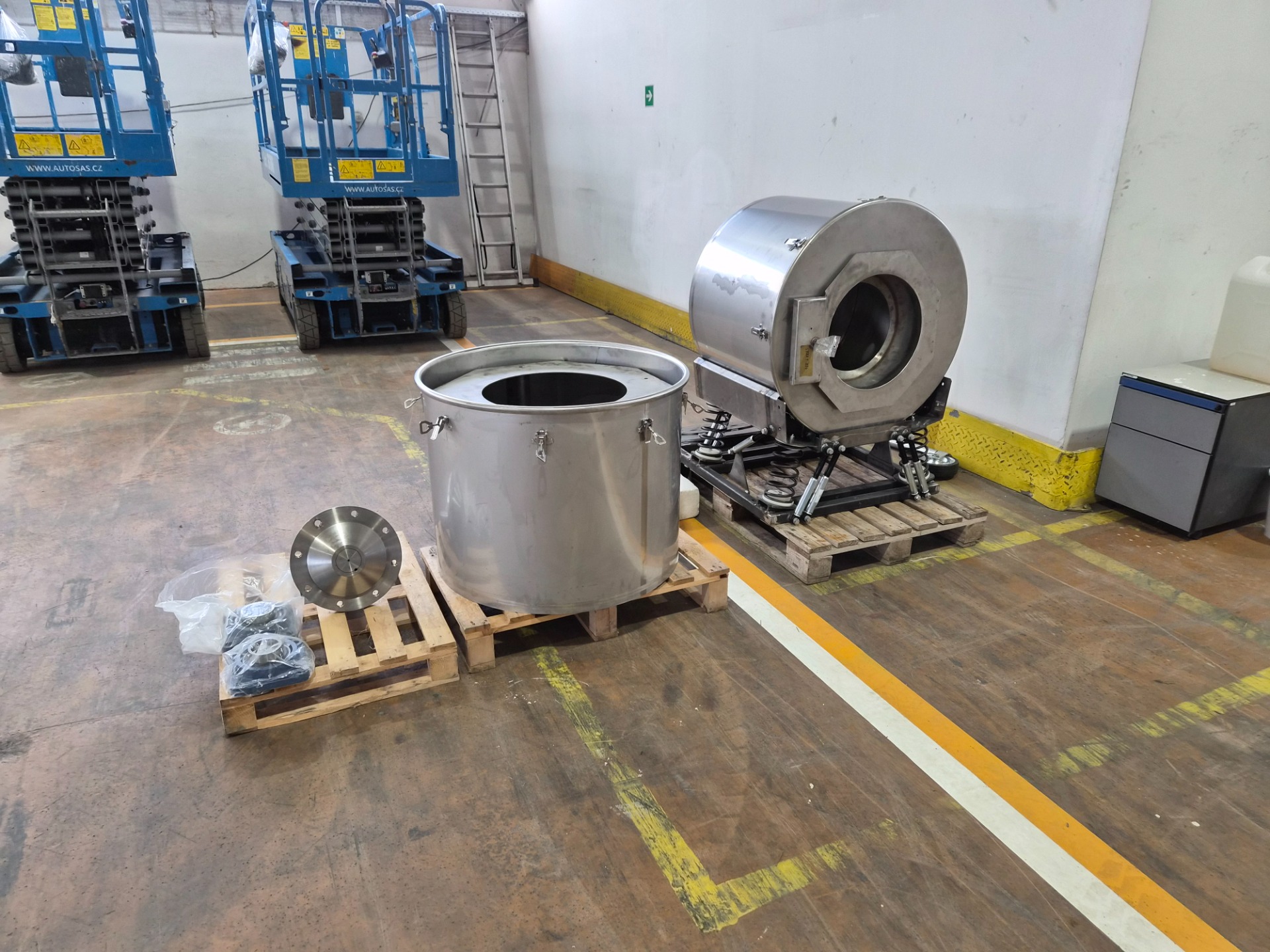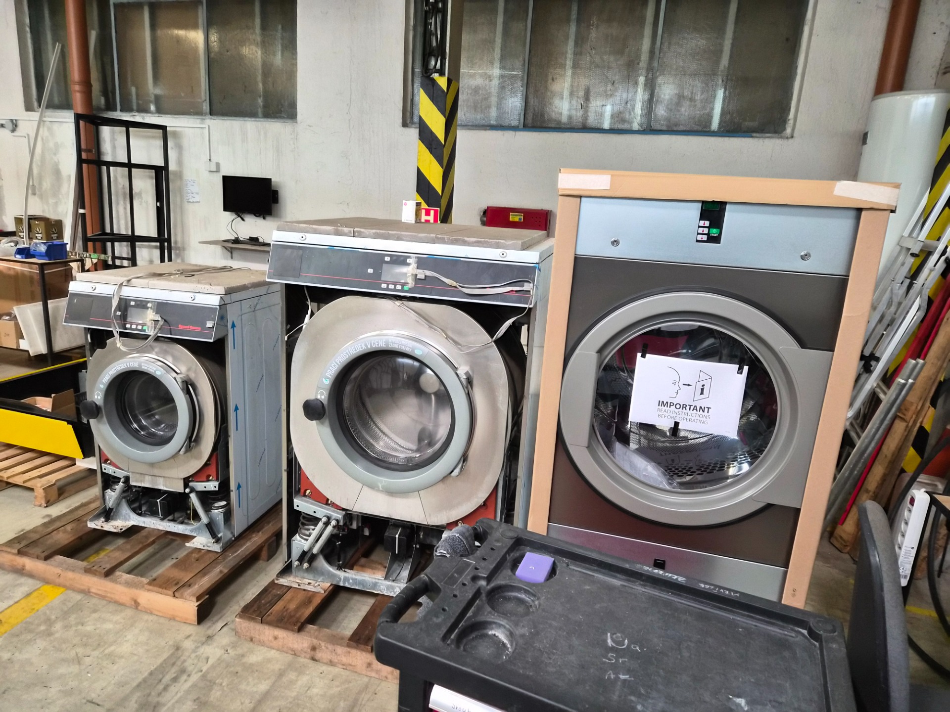Momentálně tato nová hala funguje jako sklad, protože ještě není zkolaudovaná (musí se dle nesmyslných požadavků z úřadů dodělat světlíky, probourat obrovské vrata, kterými hotové výrobky poputují ven, atd.). Kromě skladu se tam na tajňáka vyvíjejí vlastní pračky a sušička. Zaujalo mě, že bubny nejsou válcovitého tvaru, ale tvaru oktagonového, neboť z testů vyšlo, že tento tvar umožňuje daleko lepší prosycení vody mezi praný materiál, který je tak daleko lépe vypraný. Také jsme se dozvěděli, že velké pračky budou mít objem nikoliv 18 kg, jak tomu bylo u francouzských praček, ani 20 kg, jak tomu bylo u vlastních kiosků s cizími bubny, ale nádherných 23 kg! ⭕