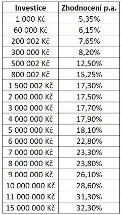 Pro lepší představu o tom, kolik procent se dá ročně maximálně z projektu dostat, jsem vytvořil tabulku, z které je patrné, kam až se zhodnocení může při určité investici vyšplhat. V tabulce jsou zásadní úrovně, při kterých se zhodnocení zvyšuje, ale dá se samozřejmě investovat libovolná částka. Nad 15 000 000 Kč už se ale zhodnocení nemění. Důležité (velmi) je také to, že úroky jsou vypláceny měsíčně!